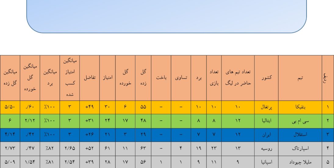 استقلال ایران با کمترین گل خورده و کسب تمام امتیازات ممکن، صدرنشین عملکرد دفاعی و پیروزی در لیگهای برتر فوتسال جهان شد و بالاتر از تیمهای مطرح جهان ایستاد.